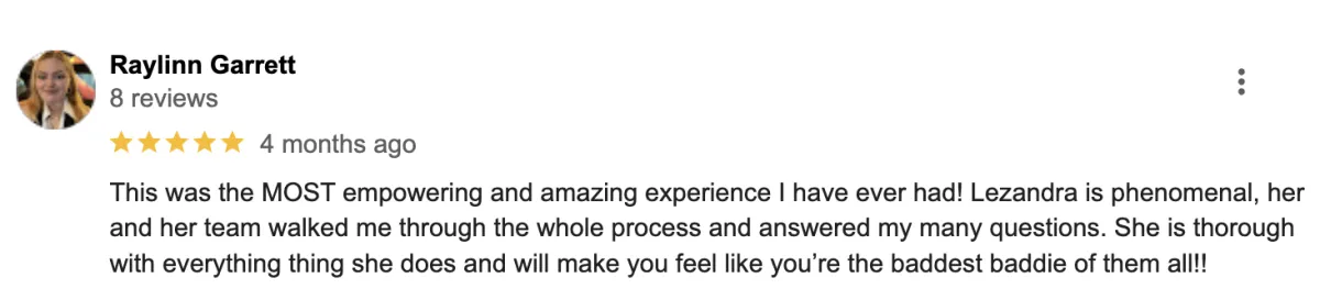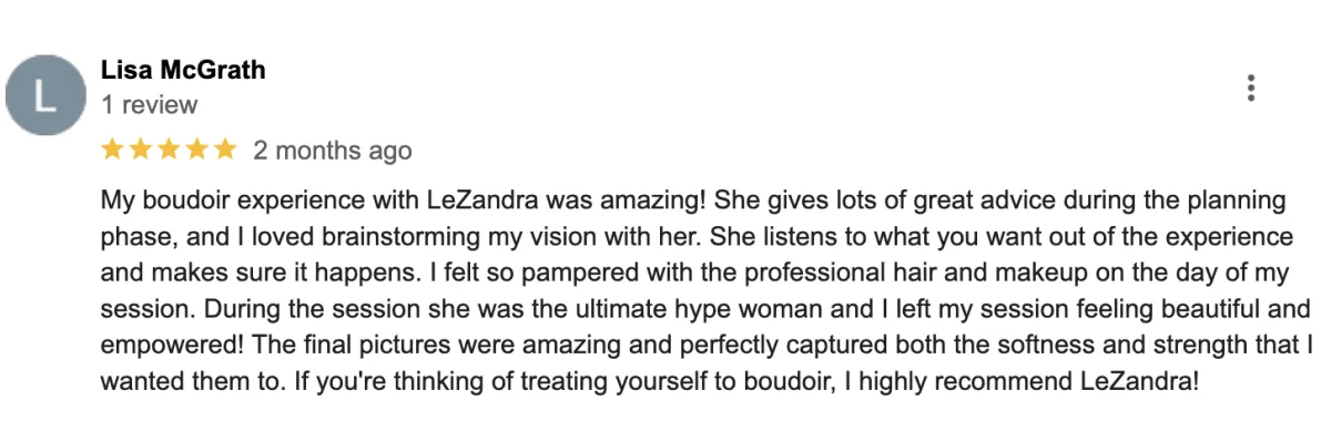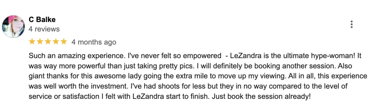 "During the session she was the ultimate hype woman and I left feeling beautiful and empowered!